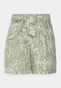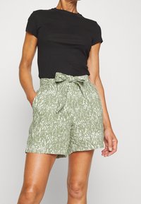 Shorts verts à motifs avec une taille à nouer, longueur mi-cuisse, tissu texturé, associés à des chaussures noires faciles à enfiler.
