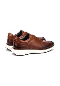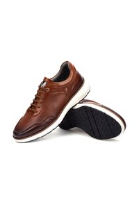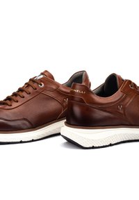 Baskets montantes en cuir marron avec panneaux latéraux texturés et semelle blanche amortie, vues de profil sur fond blanc.