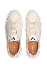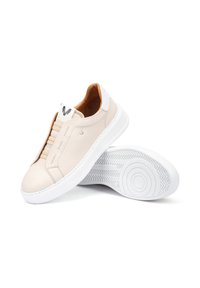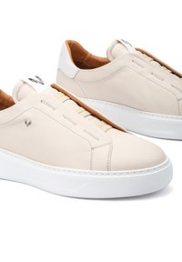 Baskets basses beiges avec semelle épaisse blanche, design sans lacets, détails de couture subtils et doublure intérieure douce marron.