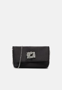 Pochette en satin noir avec une bandoulière en chaîne métallique, dotée d'un accent de broche florale argentée sur le devant. Portée avec une chemise rayée.