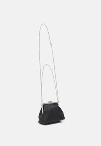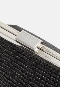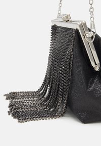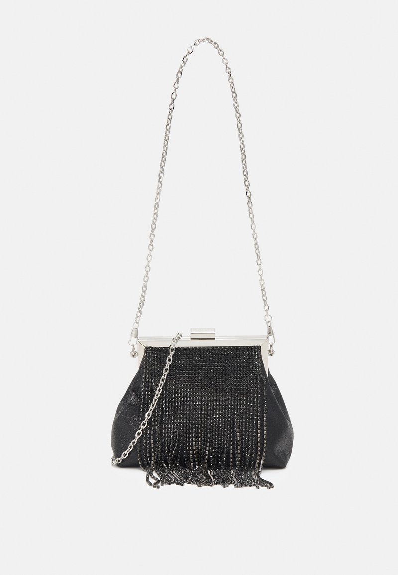 Pochette de soirée noire avec cadre en métal argenté, longue bandoulière chaîne et détails en franges de perles noires à l'avant.