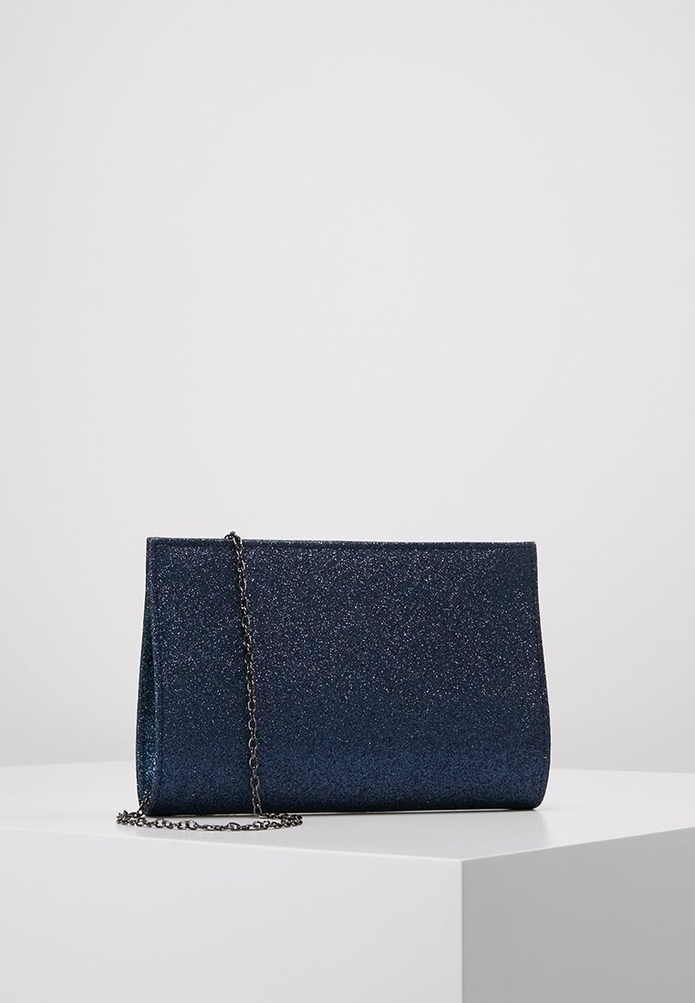 Pochette bleu marine pailletée avec une fine bandoulière noire amovible, présentée sur une surface blanche contre un fond gris clair.