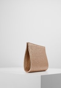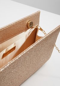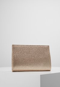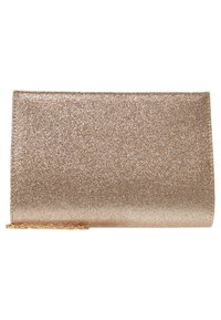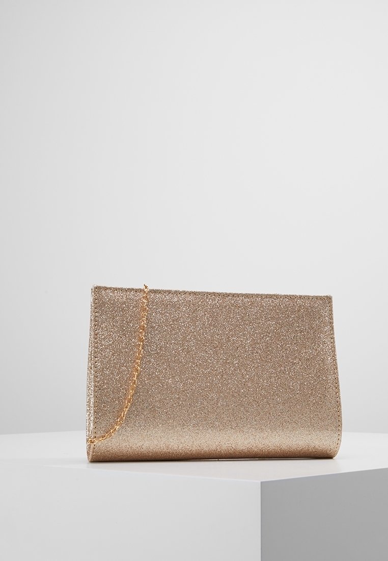 Pochette rectangulaire dorée scintillante avec une fine chaîne dorée reposant sur un piédestal blanc contre un fond uni.