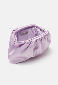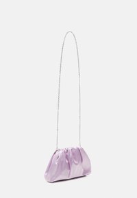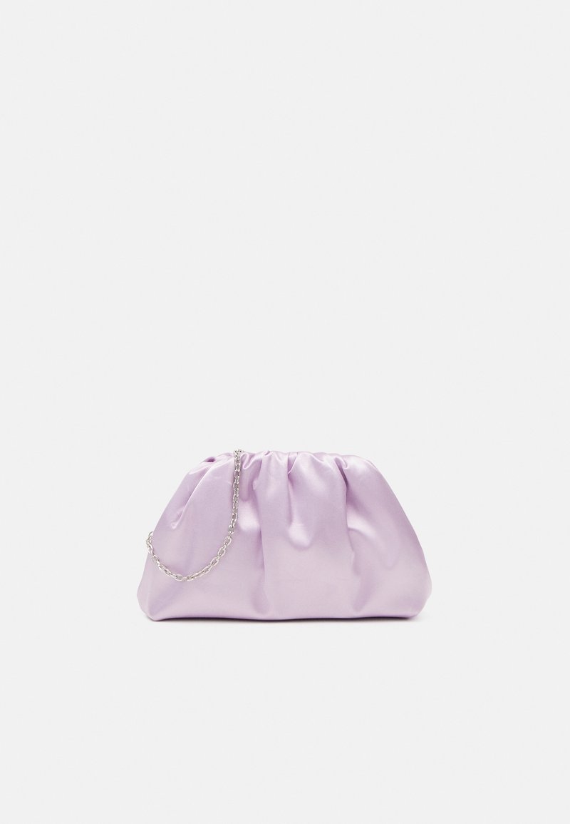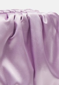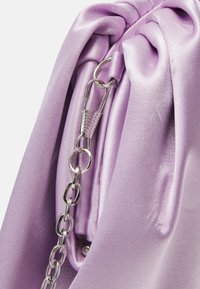 Pochette en satin lavande avec des fronces douces et une bandoulière en chaîne argentée reposant sur un fond gris clair uni.