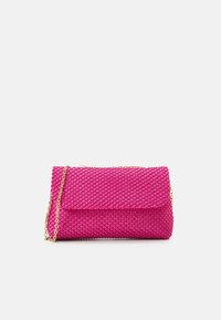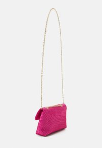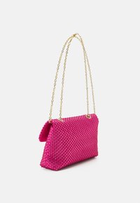 Personne portant une chemise rayée beige et un pantalon gris avec un sac bandoulière rose vif texturé accroché au niveau de la taille.