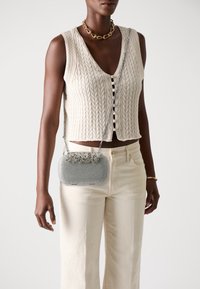 Femme noire portant un gilet court crème sans manches en maille torsadée, un pantalon crème taille haute, un collier chaîne doré et un sac bandoulière argenté texturé.