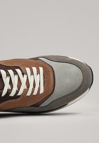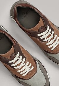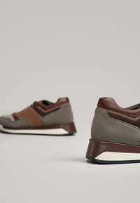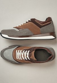 La chaussure présente un mélange de matériaux en daim gris, marron et beige, avec un bout arrondi, des lacets blancs et une semelle en caoutchouc brun foncé.