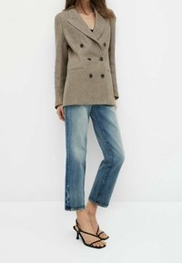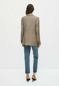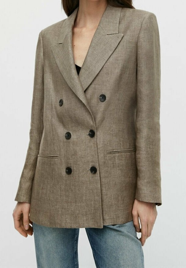 Blazer marron à double boutonnage en lin avec revers en pointe, boutons noirs et poches latérales, porté sur un haut noir et un jean.