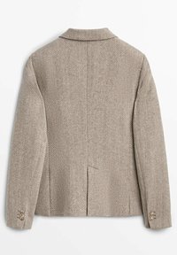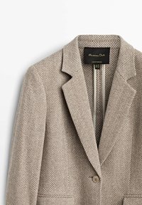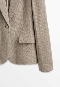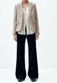 Femme portant un blazer beige en chevrons sur une chemise beige ouverte à boutons, pantalon noir, mains dans les poches, vue du cou aux hanches.