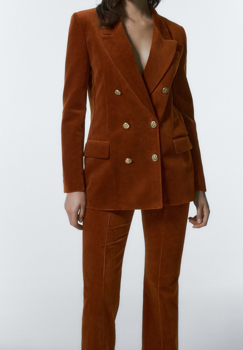 Costume en velours côtelé couleur rouille comprenant une veste croisée à boutons dorés et deux poches, associé à un pantalon assorti et ajusté.