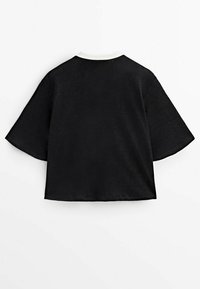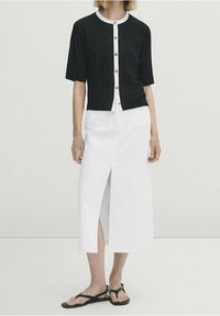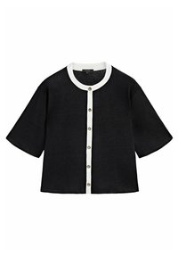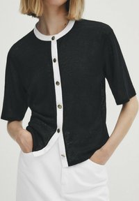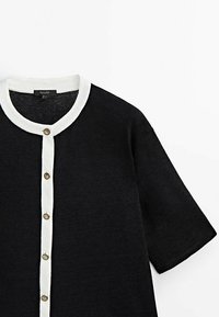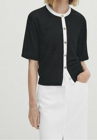 Cardigan noir à manches courtes en tissu léger, avec un col blanc et une patte de boutons, assorti à une jupe blanche.
