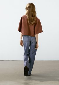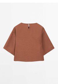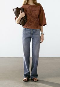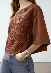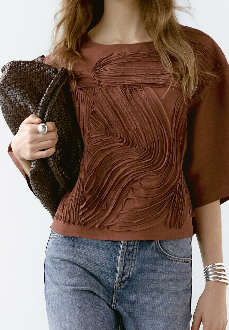 Haut marron texturé avec un design en tissu superposé, accompagné d'une pochette tissée foncée et d'un jean en denim bleu clair. Bracelet en métal au poignet.