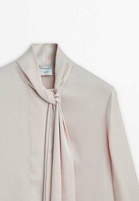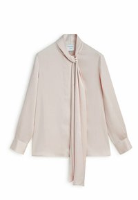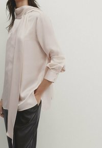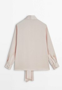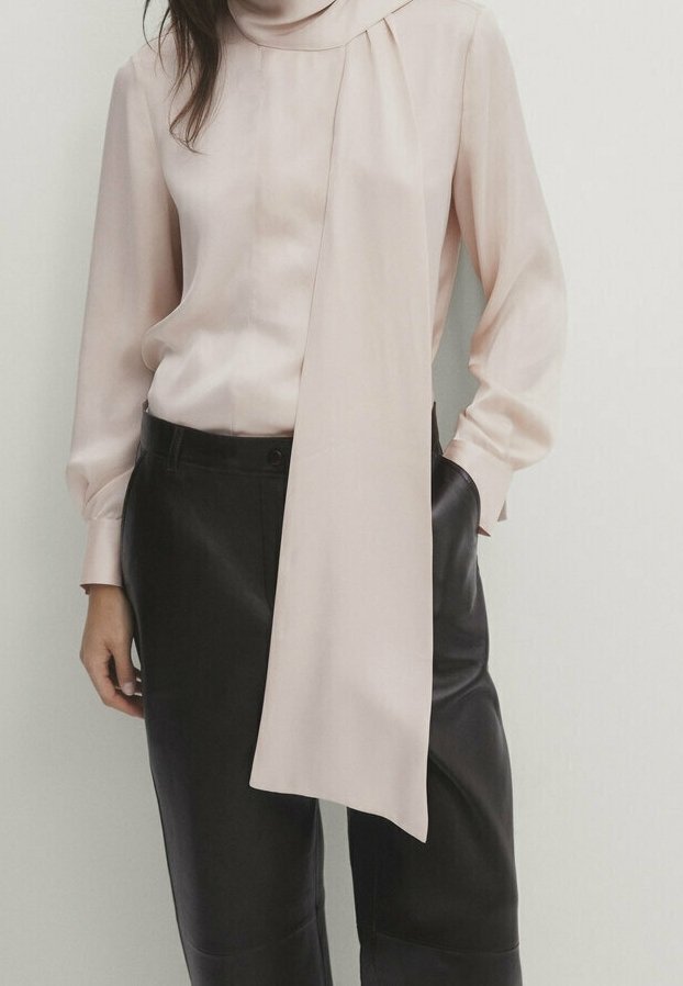 Blouse en satin rose pâle avec un col drapé et un long détail de nœud en drapé, associée à un pantalon noir taille haute au texture lisse et brillante.