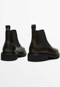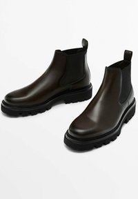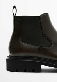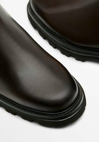 Botte Chelsea en cuir marron avec panneaux latéraux élastiques, une languette d'aide au chaussage et une semelle en caoutchouc noire robuste avec une surface texturée antidérapante.