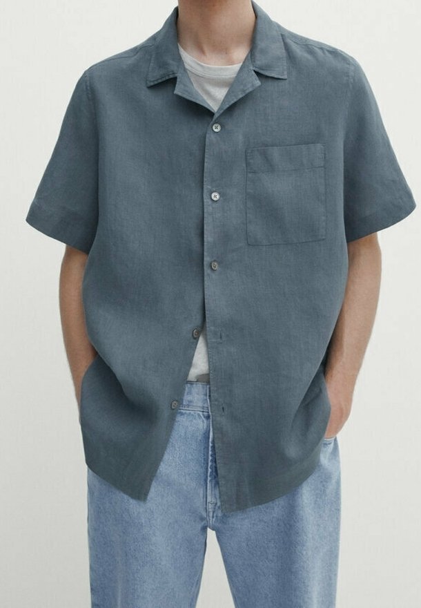 Homme portant une chemise à manches courtes, boutonnée, de couleur gris foncé, par-dessus un t-shirt blanc, associée à un jean bleu clair, les mains dans les poches.