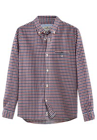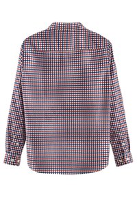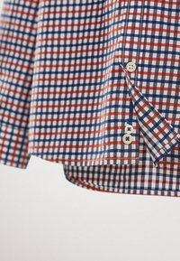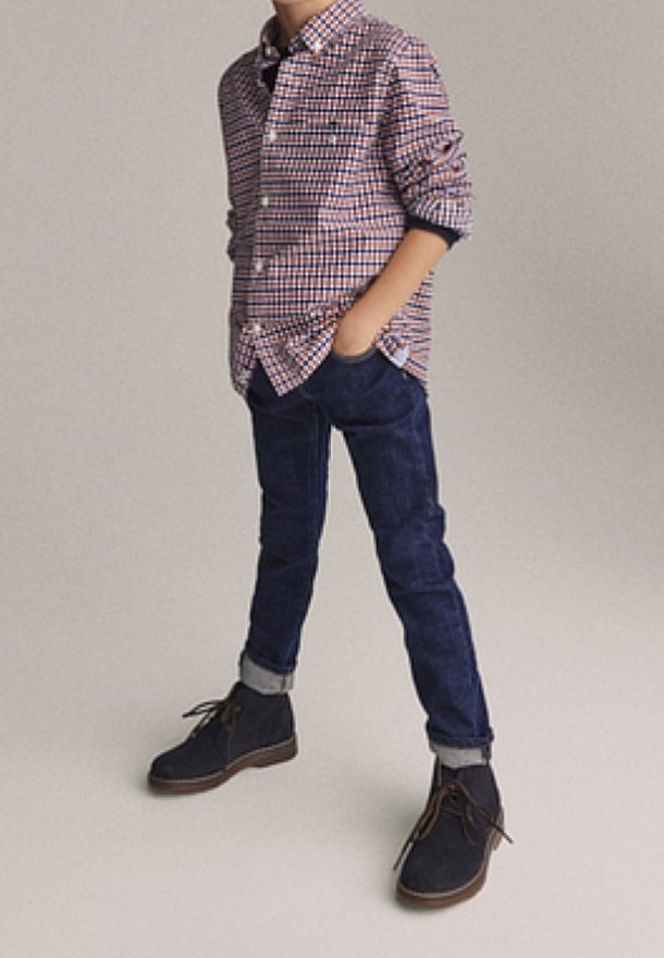 Chemise à carreaux rouge et bleu, assortie à un jean slim bleu marine et des bottines en daim navy avec des lacets marron.