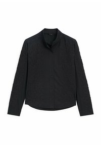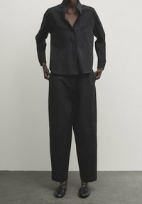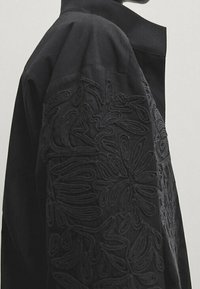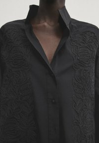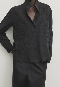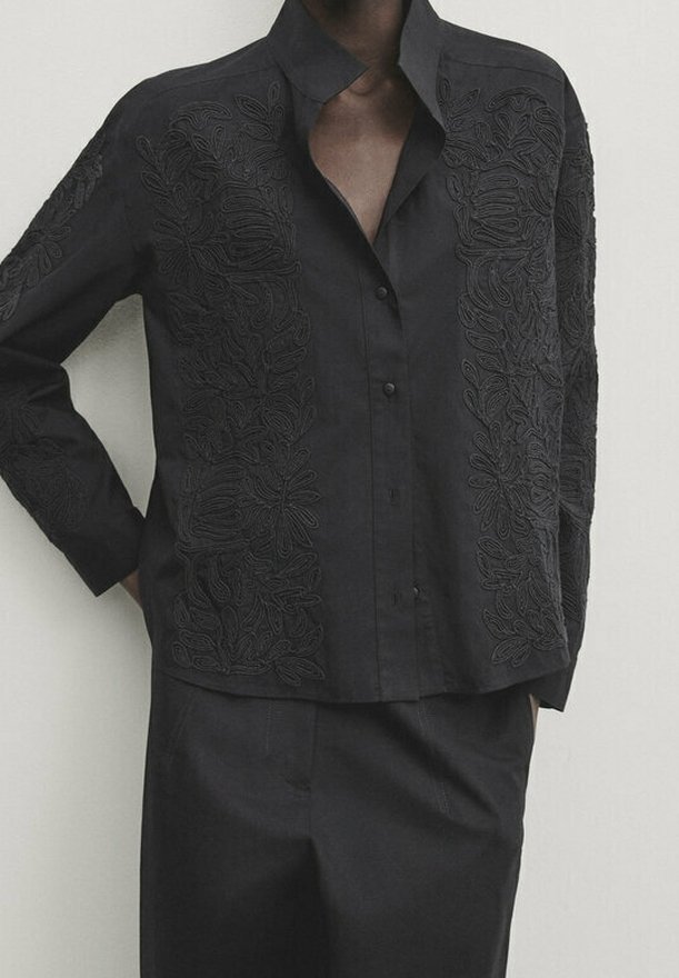 Chemise noire à manches longues boutonnée avec broderie florale portée avec une jupe noire assortie, mains du mannequin dans les poches, debout devant un fond uni.