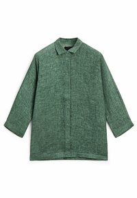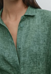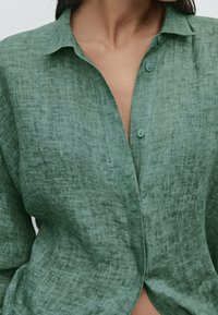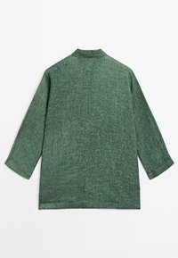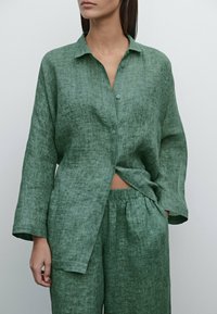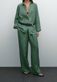 Chemise en lin verte à coupe décontractée, boutonnée sur le devant, manches longues, avec une surface texturée, associée à un pantalon ample assorti.