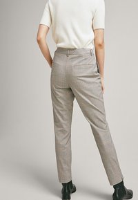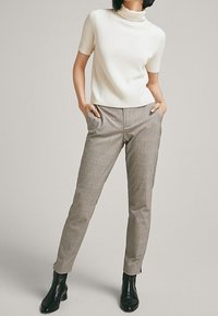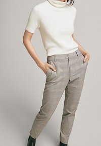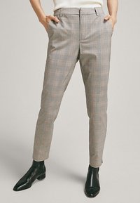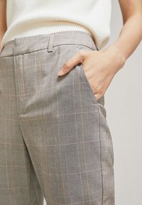 Pantalon à carreaux gris coupe ajustée, doté de poches latérales et d'une texture lisse, assorti à des bottines noires.