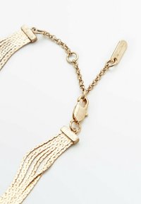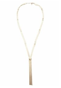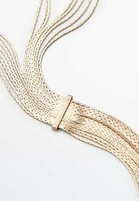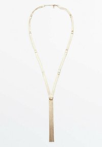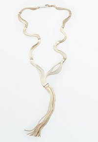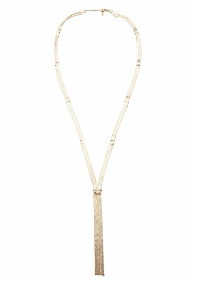 Collier long en chaîne dorée avec plusieurs fines chaînes et un pendentif en forme de pampille suspendu à l'extrémité centrale.