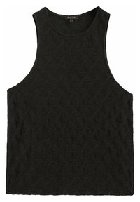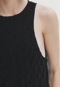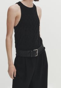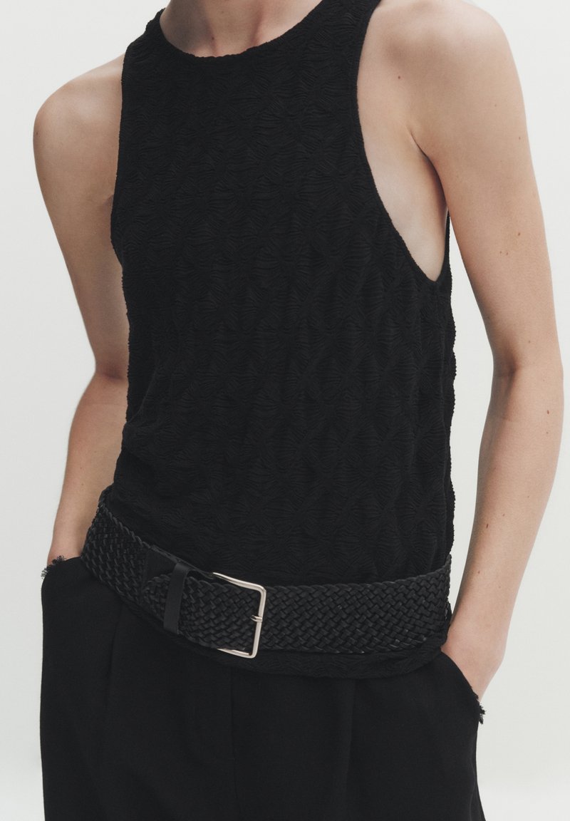 Haut noir sans manches texturé avec larges emmanchures, accompagné d'une ceinture tissée noire assortie et de pantalons noirs, mains dans les poches.