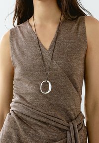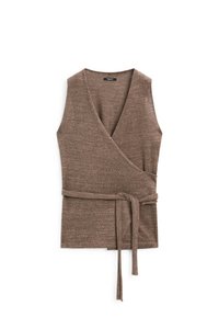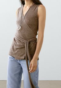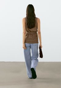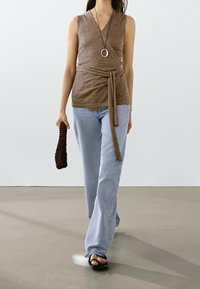Haut marron sans manches avec un design portefeuille et un côté noué. Associé à un jean ample bleu clair et un sac tissé foncé. Texture lisse.