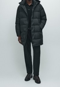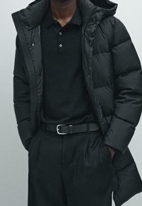 Homme portant une doudoune noire sur un polo noir avec un pantalon noir et une ceinture noire, les mains dans les poches, sur un fond neutre.