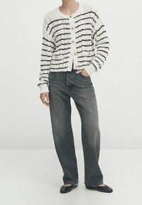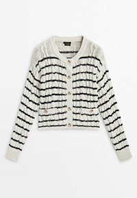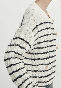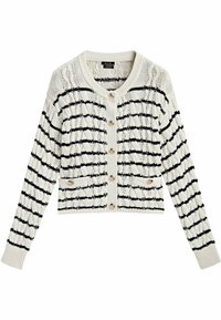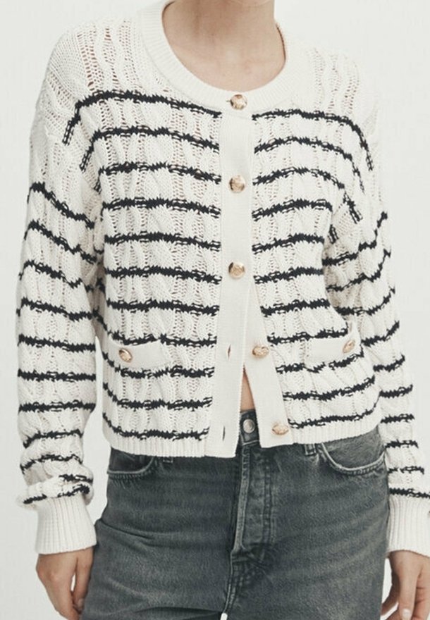 Cardigan en tricot blanc avec des rayures noires horizontales, des boutons dorés et deux poches avant, porté avec un jean gris foncé.