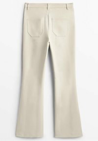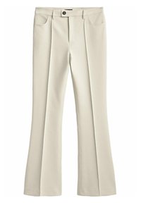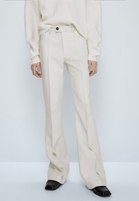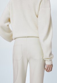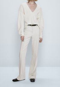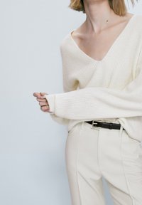 Pull en maille côtelée ivoire avec un décolleté en V profond, associé à un pantalon ajusté couleur crème et une ceinture noire. Chaussures à bout carré noires.