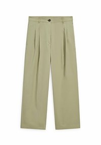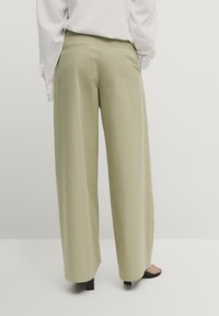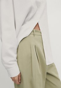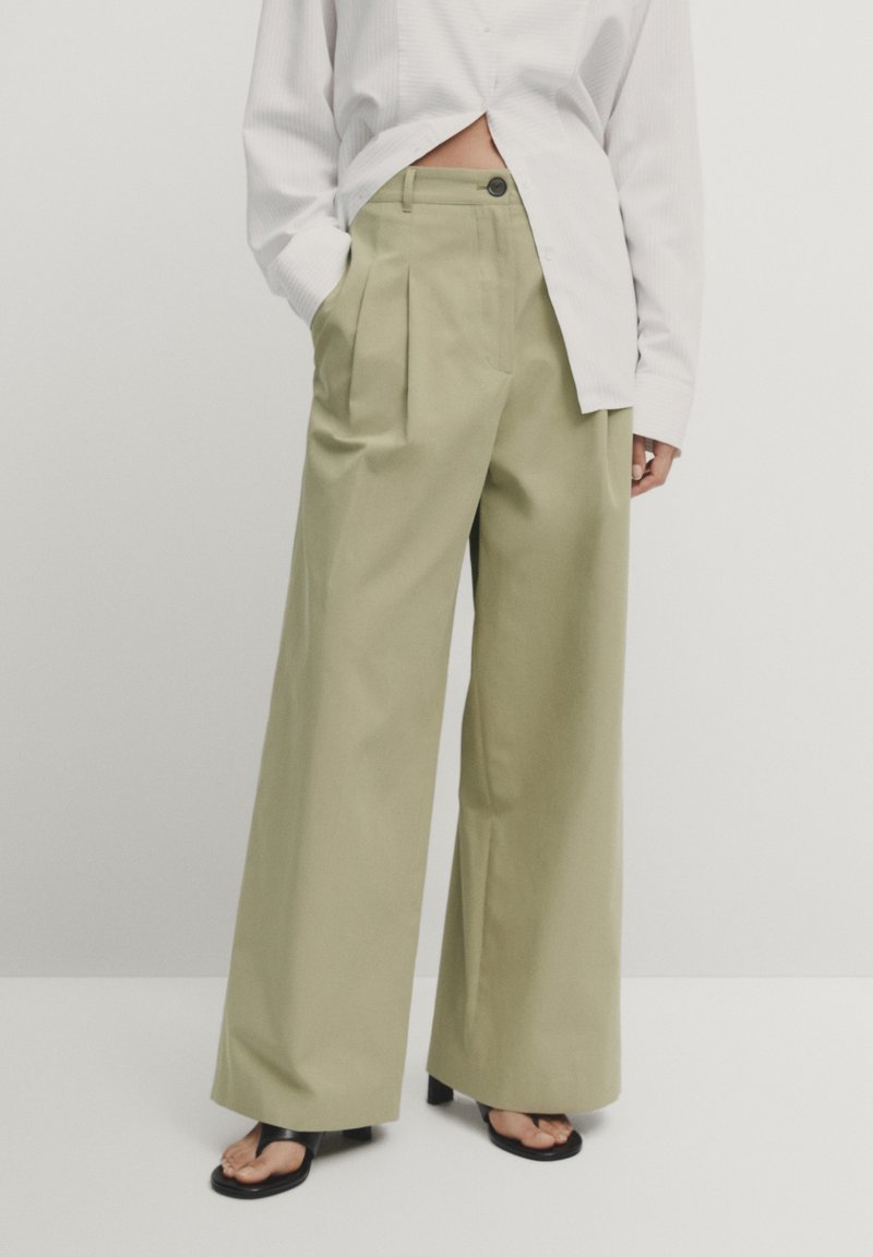 Femme portant un pantalon beige taille haute à jambes larges, une chemise blanche à manches longues avec une fente, et des sandales à talons ouvertes noires, les mains dans les poches.