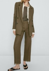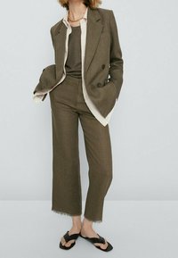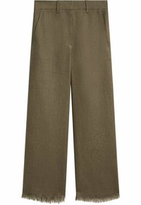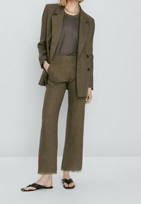 Pantalon vert olive sur mesure avec une légère évasement, doté d'un ourlet effiloché et de poches latérales. Associé à des sandales plates noires.