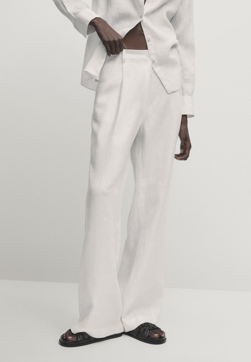 Pantalons larges en lin blanc avec une texture lisse, présentant une taille ajustée et une coupe ample. Accompagnés de sandales noires à lanières.