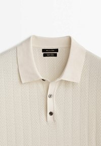 Polo crème avec un motif en maille texturée, doté d'une patte de boutonnage à trois boutons et de manches courtes. Tissu doux et respirant.