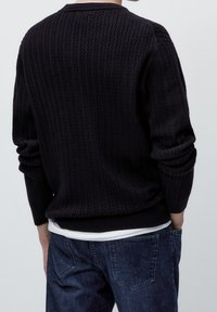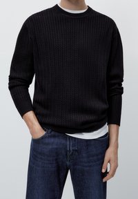 Homme portant un pull noir texturé à manches longues par-dessus une chemise blanche, une main dans la poche, jeans bleus, debout devant un fond uni.