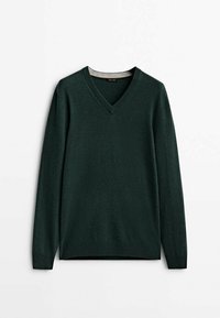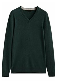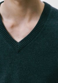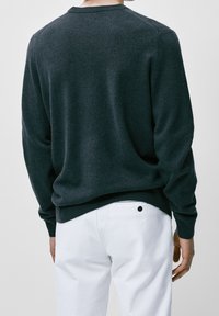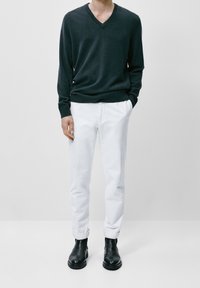 Homme portant un pull gris foncé à col en V à manches longues et un pantalon blanc, les mains dans les poches, sur un fond clair uni.