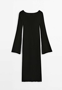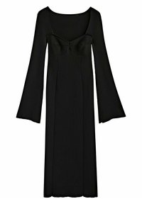 Robe midi noire à manches longues et côtes, avec un décolleté carré et un corps ajusté. Assortie à des escarpins noirs à bout pointu et avec un minimum de détails.