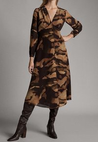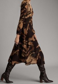 Femme portant une robe midi à imprimé abstrait marron et noir avec des manches longues, un fente à l'avant, associée à des bottes marron foncé jusqu'aux genoux, se tenant sur un fond gris.