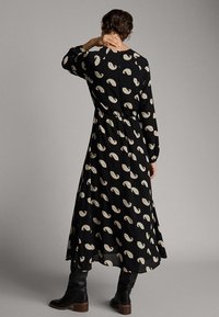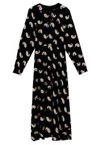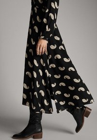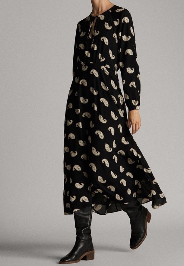Robe noire à manches longues, avec un détail en forme de clé et un motif paisley beige. Associée avec des bottes en cuir noir jusqu'aux genoux et une semelle texturée.
