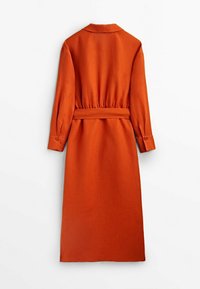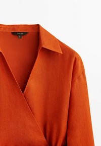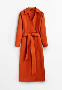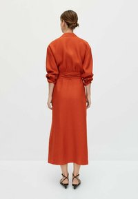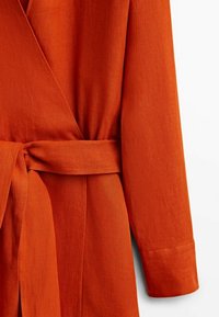 Robe portefeuille en lin rouille avec manches longues, décolleté en V profond et ceinture intégrée. Comprend des poches latérales et une silhouette fluide. Portée avec des sandales noires à lanières.