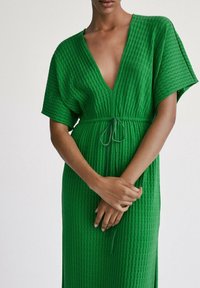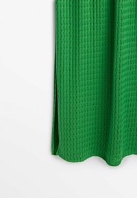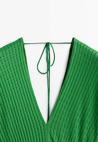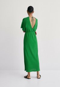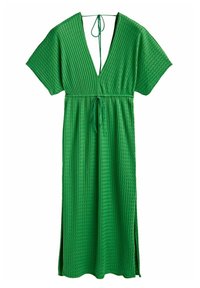 Robe maxi verte texturée avec un décolleté en V profond et des manches courtes, dotée d'une ceinture à nouer à la taille pour un ajustement et d'une fente latérale pour faciliter les mouvements.