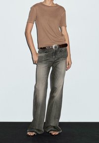 Personne portant une chemise marron unie à manches courtes rentrée dans un jean avec une ceinture marron foncé ornée d'une boucle décorative argentée.