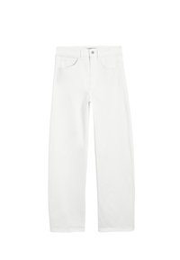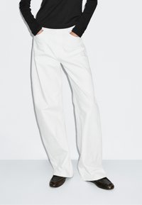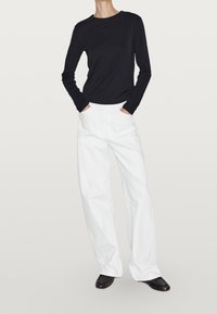 Personne portant un pantalon blanc à jambes larges, les mains dans les poches, un haut noir à manches longues et des chaussures noires, se tenant debout contre un fond clair uni.