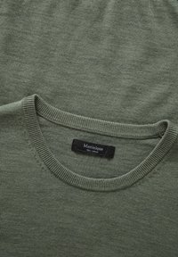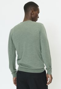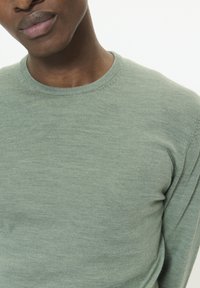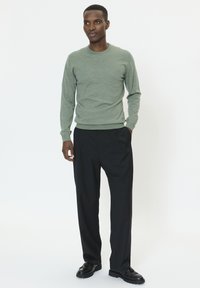 Homme portant un pull à manches longues vert clair et un pantalon noir, debout devant un fond blanc uni.
