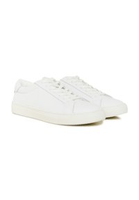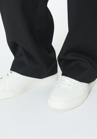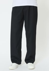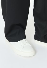 Personne portant un pantalon noir ample et des baskets blanches, debout devant un fond clair uni.
