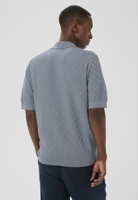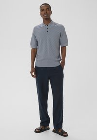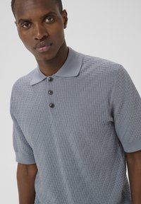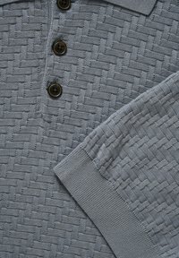 Homme portant un polo à manches courtes texturé bleu clair avec trois boutons foncés et un pantalon bleu foncé, debout avec une main dans la poche.