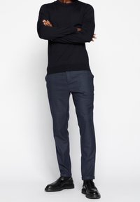 Homme portant un pull noir ajusté à col rond avec manches longues et un pantalon bleu texturé, les mains dans les poches, sur un fond uni.