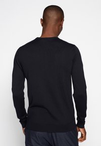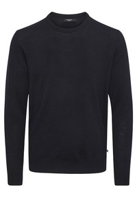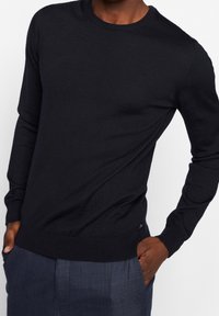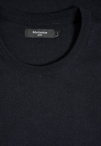 Pull en tricot bleu marine avec un motif texturé, col rond, poignets et ourlet côtelés. Petit logo brodé sur la poitrine.