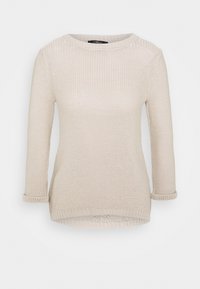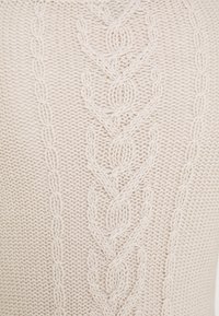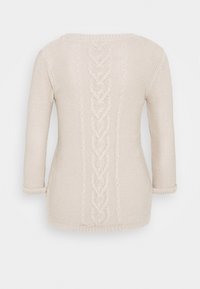 Pull beige en tricot à manches longues, col rond, avec poignets et ourlet côtelés, présenté sur un fond blanc uni.