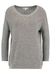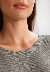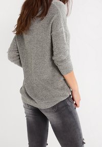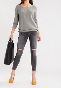 Femme portant un pull en maille gris clair et un jean gris foncé déchiré au genou sur fond blanc.