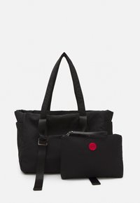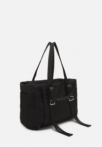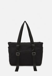 Sac fourre-tout rectangulaire noir avec deux poignées et des sangles avant réglables avec boucles argentées sur un fond uni.
